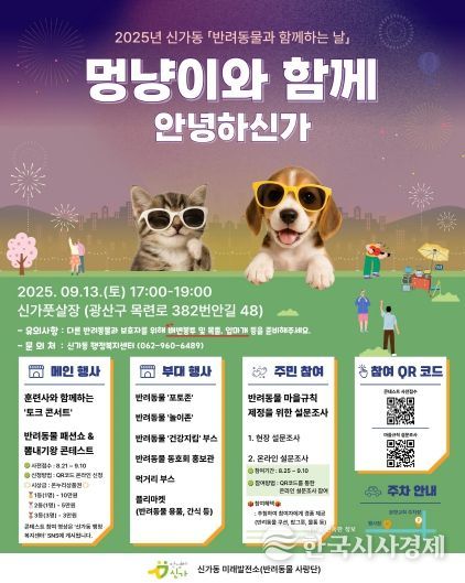 9일 신가동(동장 박세경)에 따르면, ‘멍냥이와 함께 안녕하신가’는 13일 오후 5시부터 광산구 신가풋살장(광산구 목련로 382번안길 48)에서 열린다.