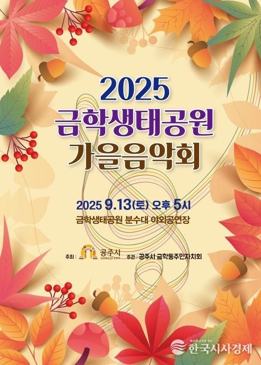 한국시사경제 김태훈 기자 | 공주시 금학동 주민자치회는 오는 13일 금학생태공원 내 분수대 야외무대에서 ‘2025 금학생태공원 가을음악회’를 개최한다고 밝혔다.