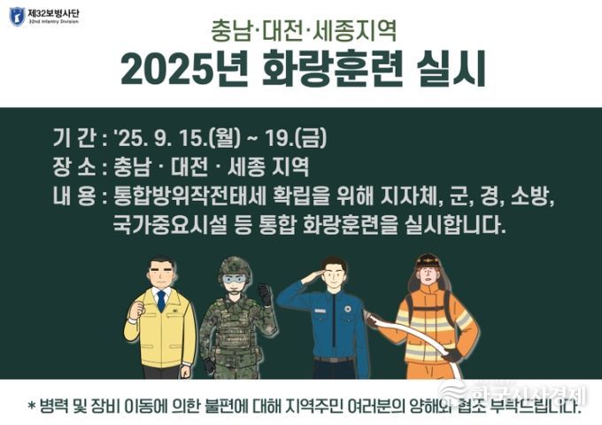 한국시사경제 김태훈 기자 | 육군 제32보병사단은, 오는 9월 15일부터 9월 19일까지 충남ㆍ대전ㆍ세종 지역에서 화랑훈련을 한다고 밝혔다.