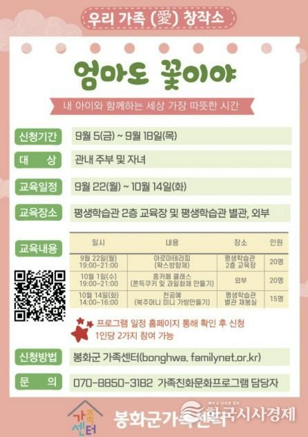 한국시사경제 한장선 객원기자 | 봉화군가족센터는 오는 9월 22일부터 10월 14일까지 총 5회기에 걸쳐 진행되는 ‘우리 가족 (愛) 창작소 - 엄마도 꽃이야’ 프로그램의 참가자를 모집한다.