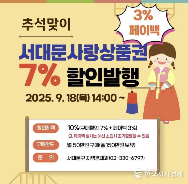 한국시사경제 한장선 객원기자 | 서대문구가 추석 명절을 앞두고 지역사회 내 소비 촉진을 통한 소상공인 매출 증대와 민생경제 활성화를 위해 이달 18일 오후 2시부터 모바일 서대문사랑상품권을 발행한다.