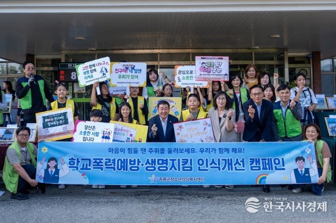 한국시사경제 충북취재본부 | 증평군청소년상담복지센터는 10일 증평초등학교 일원에서 학생과 교직원이 함께하는 ‘학교폭력 예방 및 생명 존중 등굣길 캠페인’을 펼쳤다.