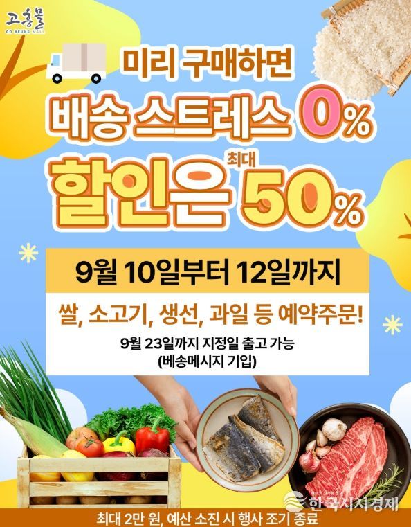 한국시사경제 전남취재본부 | 고흥군은 다가오는 추석 성수기를 앞두고 물류 혼잡으로 인한 배송 지연 부담을 줄이기 위해 9월 10일부터 12일까지 3일간 ‘추석 사전 예약전’을 고흥군 직영 온라인 쇼핑몰‘고흥몰’에서 진행한다고 밝혔다.