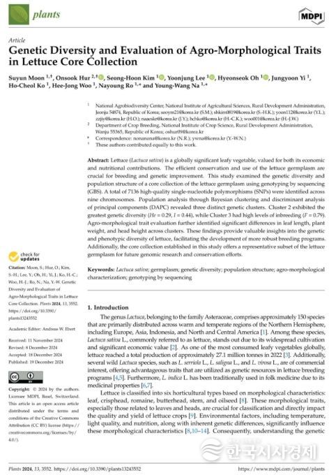 이번 연구 결과는 국제 학술지 Plants(IF 4.1)에 게재됐다. 이렇게 선발된 핵심집단 300점은 앞으로 락투신 등 상추의 유용 성분, 내재해성, 병해충 저항 관련 유전체 연구와 품종 개발에 활용될 것으로 기대된다.