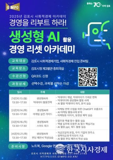 한국시사경제 기동취재팀 | 김포시는 사회적 경제기업의 인공지능 활용도를 높이기 위해 ‘생성형 인공지능(AI) 활용, 경영 리셋 아카데미’를 개설한다.