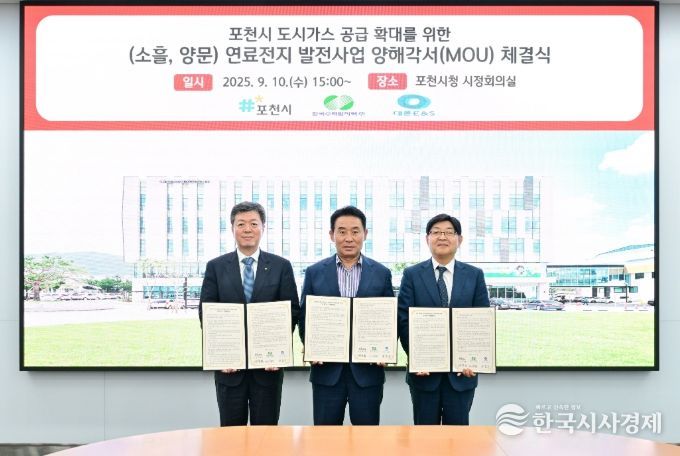이날 시청 시정회의실에서 열린 협약식에는 백영현 포천시장, 김형일 한국수력원자력 에너지믹스사업본부장, 전동수 대륜이엔에스 대표이사가 참석해 ‘포천시(소흘·양문) 연료전지 발전사업 양해각서(MOU)’를 체결했다.