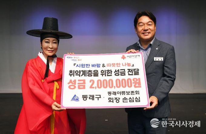 한국시사경제 부산취재본부 | 부산 동래구는 지난 7일 제60주년 동래야류 정기발표공연‘2025 동래들놀음 축제’행사장에서 동래야류보존회 손심심 회장으로부터 어려운 문화예술인을 돕기 위한 이웃돕기 성금 200만 원을 전달받았다고 밝혔다.