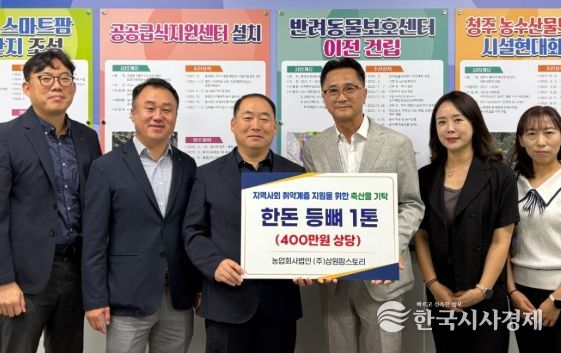 한국시사경제 김숙영 기자 | 청주시 청원구 북이면에 위치한 ㈜삼원팜스토리(대표 서중원)는 10일 청주시청을 방문해 지역 소외계층에게 전달해달라며 한돈 등뼈 1톤(400만원 상당)을 기탁했다.