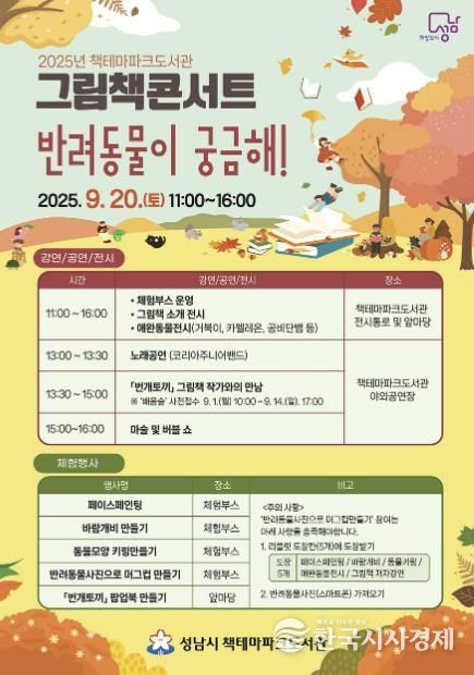 한국시사경제 경기취재본부 | 성남시는 오는 9월 20일 오전 11시~오후 4시 분당구 율동공원 내 책테마파크도서관에서 ‘반려동물이 궁금해!’ 주제로 한 그림책 콘서트를 연다.