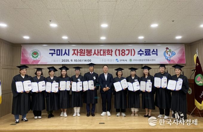 한국시사경제 경북취재본부 | 구미시는 지난 10일 구미시종합자원봉사센터(센터장 하준호) 주관으로 자원봉사대학 18기 수료식을 열고, 5개월 간 이어진 교육 과정을 성공적으로 마무리했다. 이번 수료식에서는 47명의 교육생이 수료증을 받았으며, 우수자 시상, 결의문 낭독, 소감 발표 등이 이어졌다.