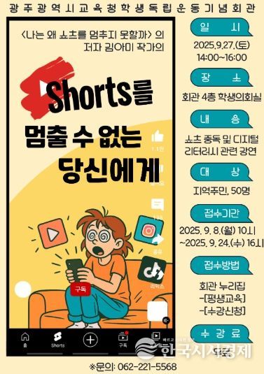 강연은 ‘나는 왜 쇼츠를 멈추지 못할까’의 저자 김아미 작가가 맡는다. 김 작가는 ‘쇼츠를 멈출 수 없는 당신에게’를 주제로 ▲디지털 미디어 리터러시의 기본 개념과 필요성 ▲알파 세대 청소년이 경험하는 쇼츠·SNS·AI 환경 ▲청소년의 건강한 성장을 위해 성인이 해야 할 역할 등을 소개한다.