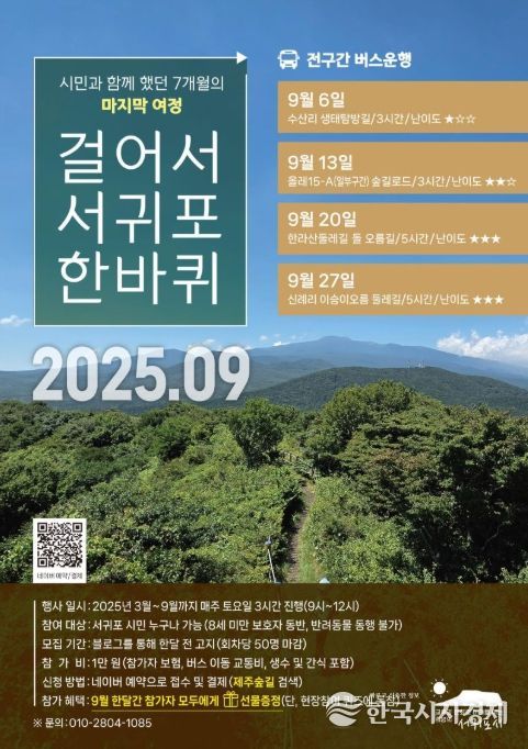 한국시사경제 한장선 객원기자 | 서귀포시는 건강한 걷기문화 확산과 시민 건강증진을 위해 운영 중인 ‘걸어서 서귀포 한바퀴’ 프로그램이 오는 9월 27일 마지막 일정을 앞두고, 누적 1,000여 명이 참여하며 큰 호응을 얻고 있다고 밝혔다.