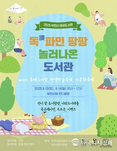 한국시사경제 경기취재본부 | 부천시는 책과 자연 속 휴식을 함께 누릴 수 있는 ‘놀러나온 도서관’ 행사를 9월 13일과 14일, 양일간 오전 10시부터 오후 5시까지 부천시청 잔디광장에서 개최한다. 이번 행사는 ‘독讀파민 팡팡, 놀러나온 도서관’을 주제로 시민들이 일상에서 독서를 더욱 친근하게 접할 수 있도록 마련됐다.