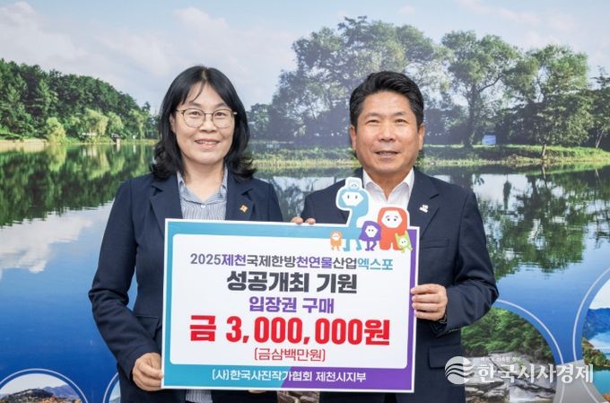 한국시사경제 충북취재본부 | (사)한국사진작가협회 제천지부는 지난 10일 제천시청을 방문해 2025제천국제한방천연물산업엑스포의 성공적인 개최를 기원하며 300만 원 상당의 입장권을 구매했다.