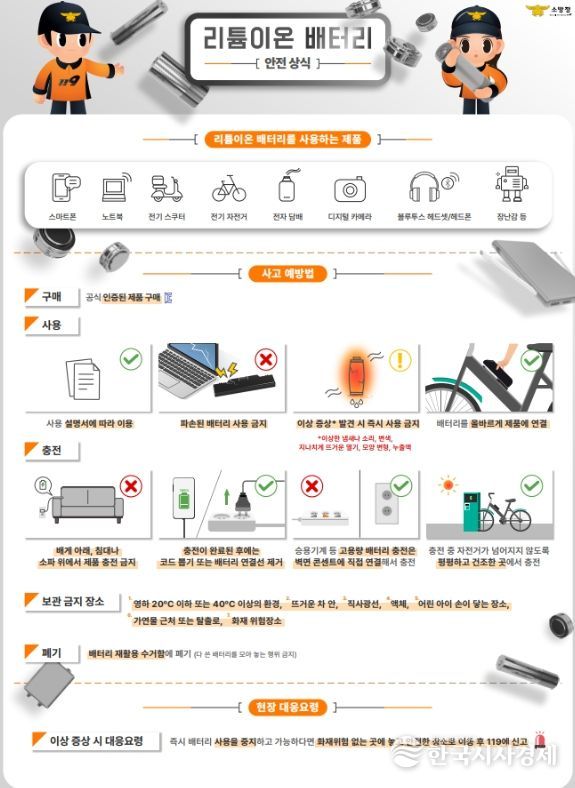 안전하게 사용하기 위해서는 △공식 인증된 제품 구매 △사용 설명서에 따른 올바른 사용 △훼손되거나 변형된 배터리 사용 금지 △충전기와 배터리를 올바르게 연결해 사용 △고온·다습하거나 직사광선을 피한 보관 △폐기 시 지정된 수거함을 통한 안전한 처리 등이 필요하다.