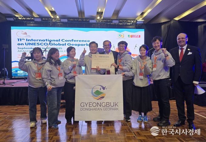 한국시사경제 경북취재본부 | 경주시는 9월 8일부터 12일(현지시각)까지 칠레 테무코에서 열린 ‘제11회 세계지질공원네트워크(GGN) 총회’에서 경북 동해안 지질공원이 ‘유네스코 세계지질공원 인증서’를 공식 수여 받았다고 밝혔다.