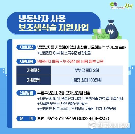 한국시사경제 윤경수 기자 | 부평구는 아이를 원하는 부부의 임신·출산을 적극적으로 지원하기 위해 ‘냉동 난자 사용 보조생식술 지원사업’을 진행한다고 12일 밝혔다.