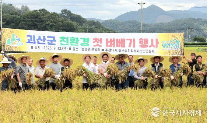 한국시사경제 충북취재본부 | 충북 괴산군은 문광면 문법리 이인모(63) 씨 농가의 논에서 친환경 벼 첫 벼 베기를 실시했다고 12일 밝혔다.