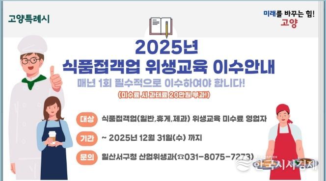 한국시사경제 윤경수 기자 | 고양특례시 일산서구는 식품접객업 영업자의 위생관리 수준 향상과 안전한 외식문화 조성을 위해, 2025년 정기 위생교육 미이수자를 대상으로 집중 안내 활동을 추진한다고 밝혔다.