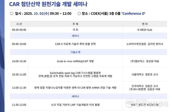 케이메디허브 전임상센터는 내달 1일 서울 코엑스에서 ‘CAR 첨단신약 원천기술 개발 세미나’를 개최한다.