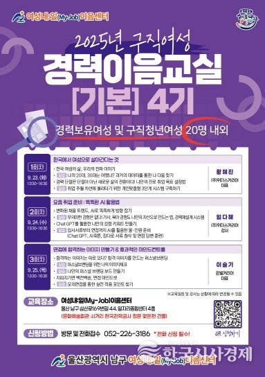 한국시사경제 울산취재본부 | 울산 남구 ‘여성내:일(My-Job)이음센터’는 9월 23일부터 25일까지 3일간 남구 일자리종합센터 4층 교육장에서 취업을 원하는 경력보유여성과 청년여성 20명을 대상으로 맞춤형 취업지원 교육 프로그램을 운영한다.