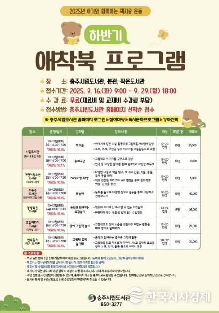 이 프로그램은 충주시립도서관, 어린이청소년도서관, 서충주도서관등 6개 산하 도서관에서 10월 14일부터 12월 5일까지 8주간 운영될 예정이다.