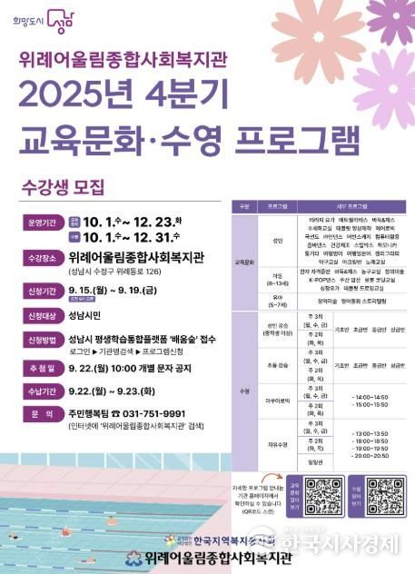 한국시사경제 경기취재본부 | 성남시는 오는 9월 19일까지 위례어울림종합사회복지관의 120개 강좌 수강생 2896명을 모집한다.