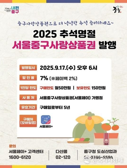 구 관계자는 “추석 명절을 맞아 발행하는 서울중구사랑상품권이 중구 소상공인에게 활력을 불어넣고, 주민들에게는 실속있고 푸근한 명절을 준비하는데 도움이 되길 바란다”며, “앞으로도 중구는 주민의 삶과 지역 상권에 힘이 되는 정책을 적극적으로 추진하겠다”고 밝혔다.