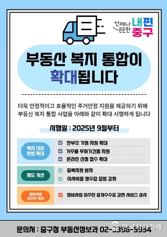 한국시사경제 한장선 객원기자 | 서울 중구가 주거 취약계층의 생활 안정을 돕기 위해 이달부터 부동산 복지 통합 사업을 확대 시행한다.