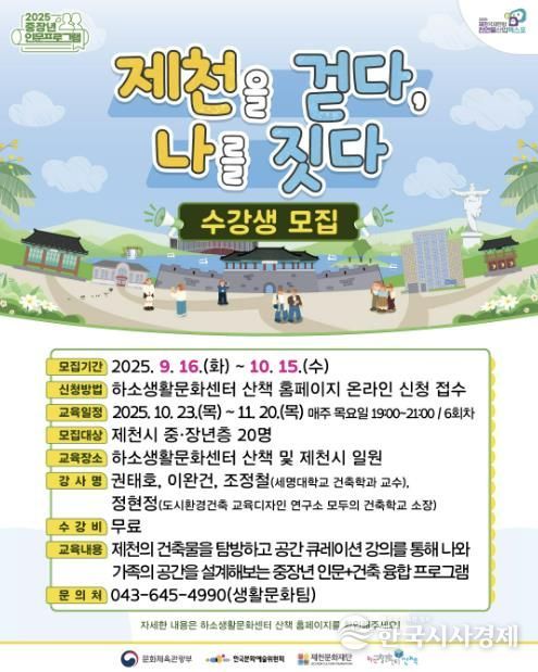 한국시사경제 충북취재본부 | 제천문화재단은 문화체육관광부가 주최하고 한국문화예술위원회가 주관하는 '2025 중장년 인문 프로그램' ‘어서와, 인문은 제천이지’의 일환으로 중장년층을 위한 건축 인문학 프로그램 참여자를 모집한다고 밝혔다.