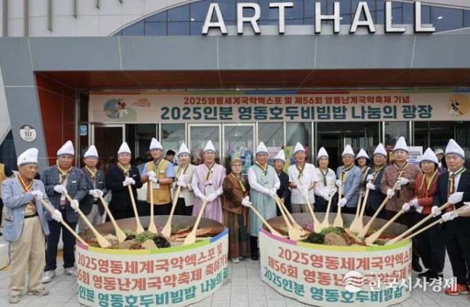한국시사경제 충북취재본부 | 약선명인 정영숙 정림한정식 대표는 지난 14일 2025 영동세계국악엑스포와 제56회 영동난계국악축제를 기념하여 영동복합문화예술회관 앞에서 2,025인분 비빔밥 나눔 행사를 개최했다.