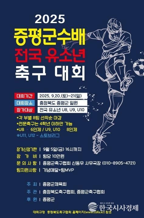 한국시사경제 충북취재본부 | 충북 증평군은 오는 19일부터 21일까지 증평종합운동장, 증평대교 잔디구장, 증평풋살경기장 등 3개 구장에서 ‘2025년 증평군수배 유소년축구대회’를 개최한다고 밝혔다.