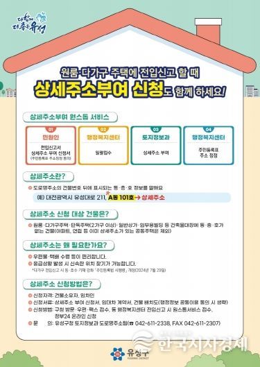 상세주소 신청은 건물 소유자 또는 소유자의 동의를 받은 임차인이 건물 배치도와 임차인임을 증명할 수 있는 서류를 지참해 유성구 토지정보과로 방문하거나 정부24 홈페이지를 통해 가능하다.