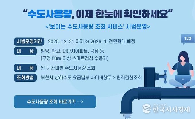 한국시사경제 경기취재본부 | 부천시는 스마트검침시스템을 기반으로 한 ‘보이는 수도사용량 조회 서비스’를 이달부터 오는 12월까지 시범 운영한다고 16일 밝혔다.