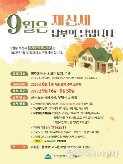 한국시사경제 윤광희 기자 | 인천 미추홀구는 9월 정기분 재산세(토지분 및 주택 2기분) 518억 원, 21만 2천여 건을 부과했다고 16일 밝혔다.