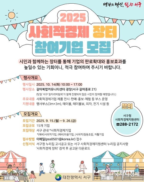 한국시사경제 대전취재본부 | 대전 서구는 사회적경제기업 제품 홍보와 판로 확대를 위한 ‘2025년 사회적경제 장터’ 참가 기업을 이달 26일까지 모집한다고 17일 밝혔다.