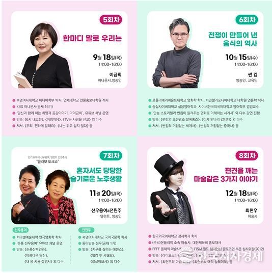 이어 ▲10월 15일은 방송인 썬 킴의 ‘전쟁이 만들어 낸 음식의 역사’ ▲11월 20일은 선우용여와 전원주가 함께하는 ‘혼자서도 당당한 슬기로운 노후생활’ ▲12월 18일 마지막 강연은 마술사 최현우의 ’편견을 깨는 마술 같은 3가지 이야기‘를 강연할 예정이다.