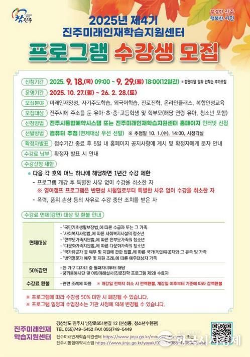 한국시사경제 윤광희 기자 | 진주미래인재학습지원센터는 9월 18일부터 29일까지‘2025년 제4기 프로그램’ 수강생을 진주시통합예약시스템과 미래인재센터 누리집을 통해 모집한다.