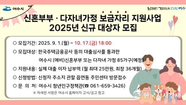한국시사경제 문화팀 | 여수시는 신혼부부와 다자녀가정을 대상으로 ‘보금자리 대출이자 지원사업’ 참여자를 오는 10월 17일까지 모집하고 있다. 이번 모집은 지난 9월 1일부터 진행 중이다.