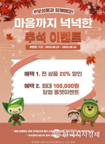 한국시사경제 김태훈 기자 | 전남 보성군은 추석 명절을 맞아 22일부터 3일간 농특산물 온라인 쇼핑몰 ‘보성몰’에서 최대 20% 할인과 다양한 적립 이벤트가 함께하는 특별 할인 행사를 진행한다.