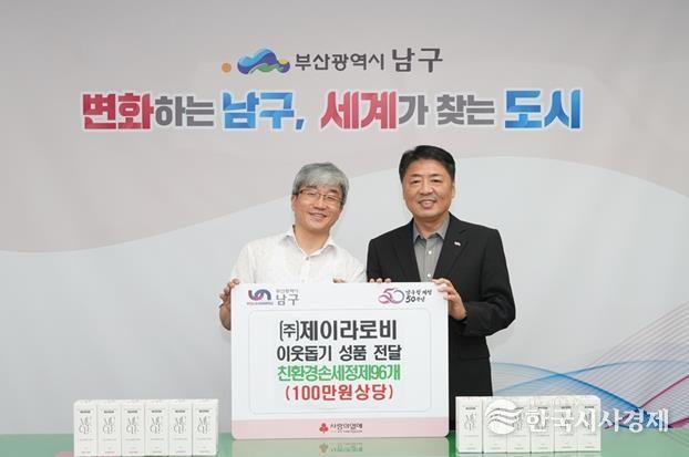 한국시사경제 부산취재본부 | ㈜제이라로비는 지난 15일 부산 남구에 100만 원 상당의 후원 물품(손세정제)을 전달했다.