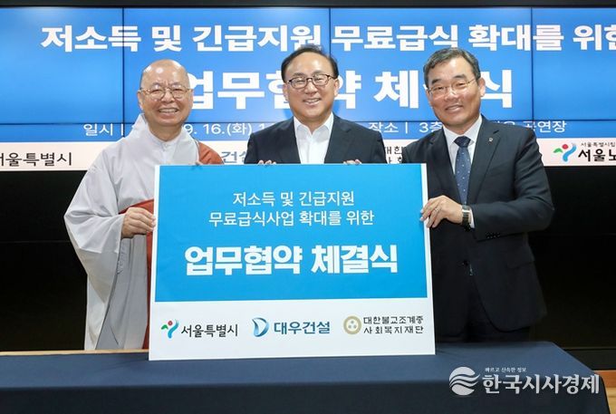 서울시는 ㈜대우건설, 대한불교조계종복지재단과의 업무협약을 통해 ‘저소득어르신 급식지원사업’ 대상자를 약 150명 늘리기로 했다.