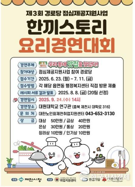 한국시사경제 충북취재본부 | 제천시는 민선8기 공약사업인 ‘경로당 점심제공사업’의 일환으로, 오는 24일 오후 2시 대원대학교 연구관에서 ‘제3회 경로당 한 끼 스토리 요리경연대회 본선을 연다고 밝혔다.