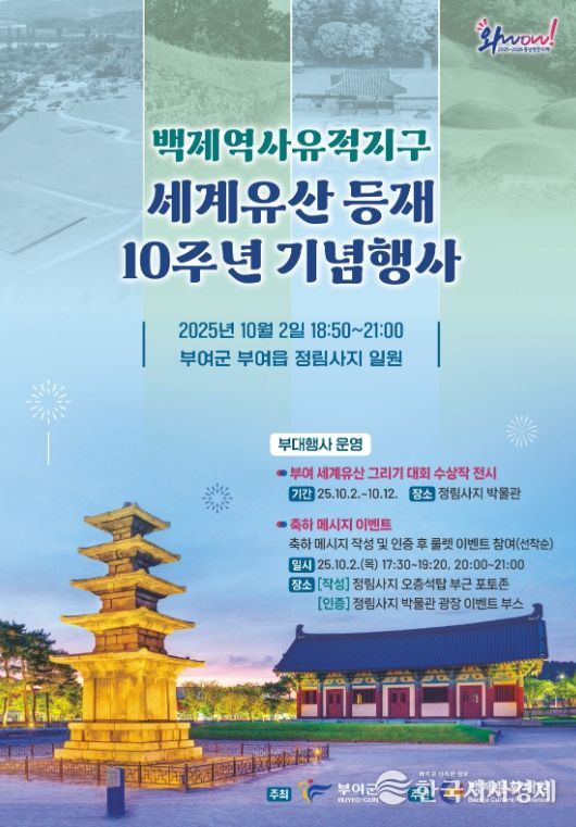 한국시사경제 김태훈 기자 | 부여군은 오는 10월 2일 정림사지 일원에서 백제역사유적지구 세계유산 등재 10주년 기념행사를 개최한다.