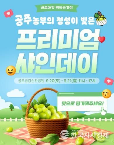 한국시사경제 권충현 기자 | 공주시 지역 포도 농가들이 오는 20일과 21일 이틀 동안 금강신관공원 내 바로마켓 백제금강점에서 ‘프리미엄 샤인데이’ 행사를 연다.