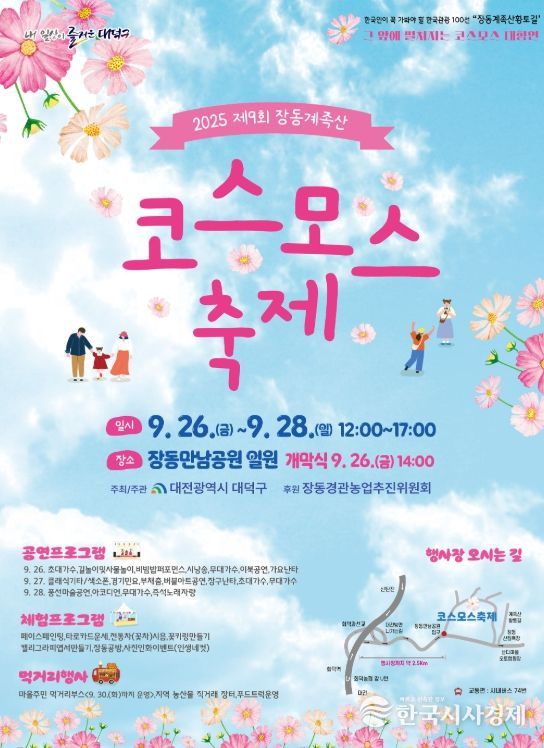 한국시사경제 대전취재본부 | 대전 대덕구는 오는 9월 26~28일 사흘간 장동만남공원 일원에서 ‘도심 속 가을의 낭만’을 주제로 ‘제9회 장동계족산 코스모스축제’를 개최한다고 19일 밝혔다.
