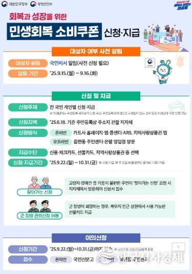 신청 방법은 온·오프라인 창구를 통해 지역사랑상품권(카드·모바일)과 신용·체크카드, 선불카드 중 선택할 수 있으며, 신청 초기 몰림에 따른 민원 혼잡을 줄이기 위해 온라인 및 오프라인 소비쿠폰 신청 시 첫째 주(9월 22일~26일)까지는 출생 연도 끝자리 기준 요일별 5부제가 적용된다. 주말에는 온라인 신청만 가능하다.