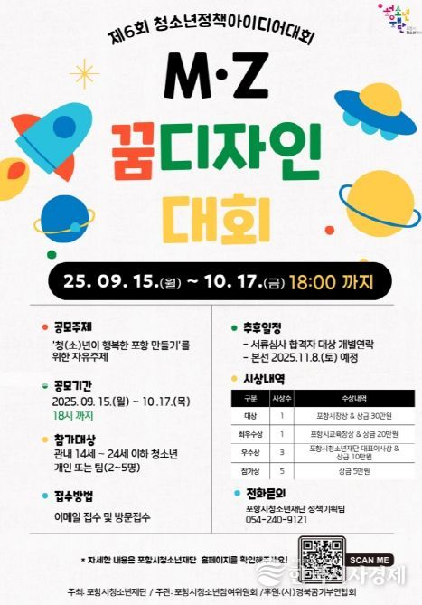 한국시사경제 한장선 객원기자 | 포항시청소년재단은 ‘청(소)년이 행복한 포항 만들기’를 주제로 청소년이 직접 청소년 관련 정책을 제안하는 ‘M·Z 꿈 디자인대회’를 개최한다.