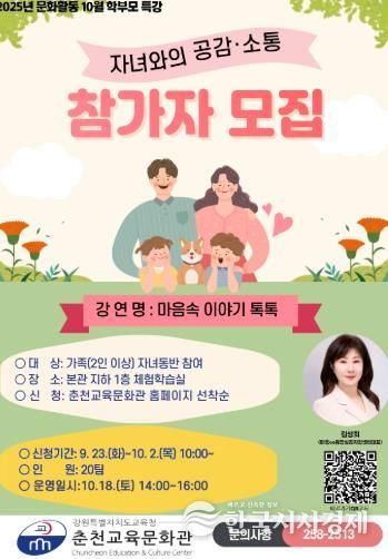 한국시사경제 이정이 기자 | 춘천교육문화관은 10월 18일과 11월 1일부터 11월 15일까지 매주 토요일에 자녀와 함께 참여하는 학부모 특강 ‘마음속 이야기 톡톡’과 ‘내 마음, 네 마음 쓰담쓰담’을 운영한다.