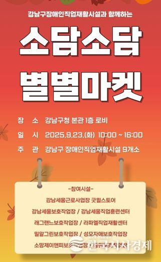 한국시사경제 이정이 기자 | 꿈이 모이는 도시, 미래를 그리는 강남구가 9월 23일 오전 10시부터 오후 4시까지 구청 본관 1층에서 장애인생산품 특별판매·홍보전 ‘소담소담 별별마켓’을 개최한다.